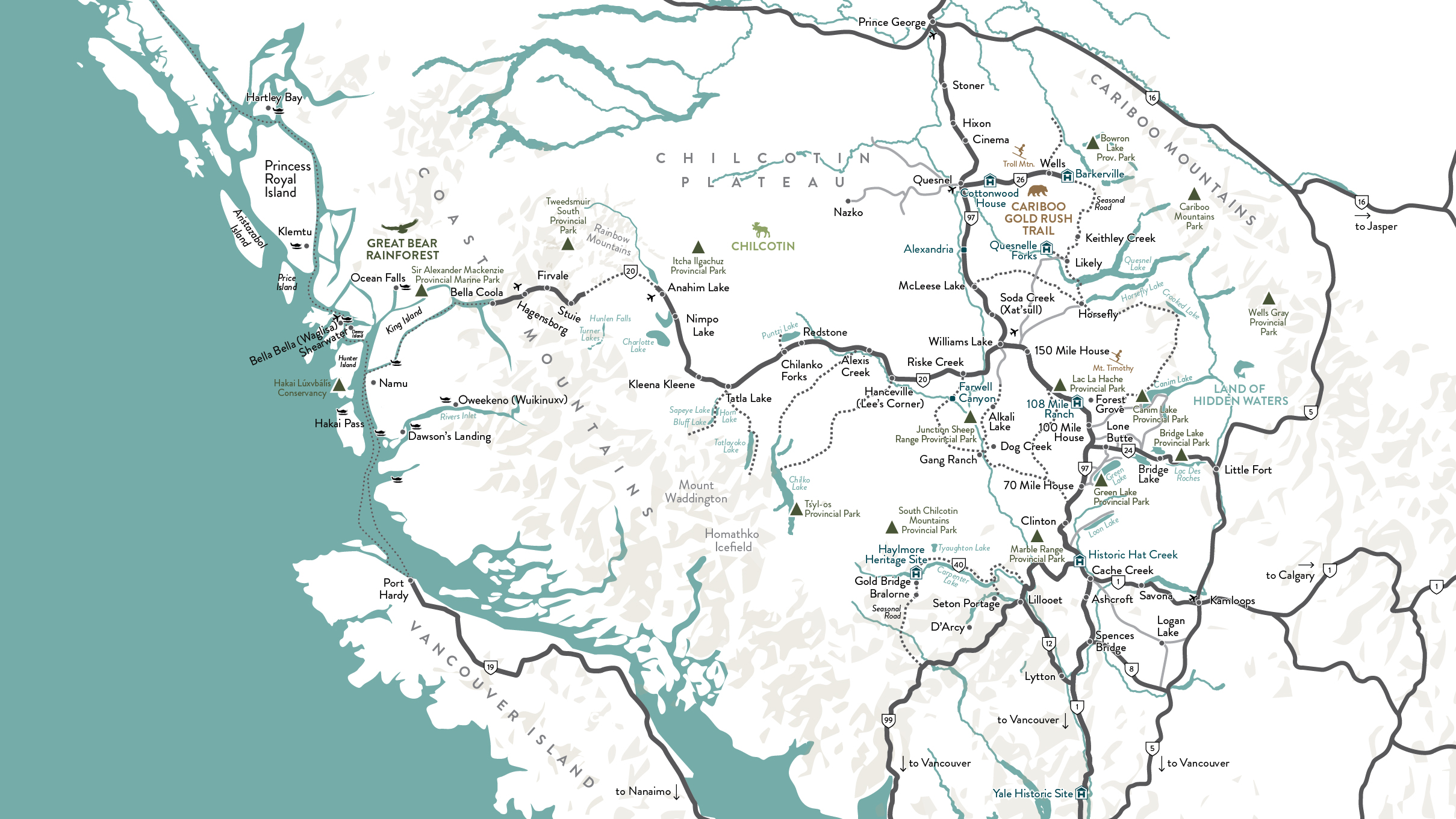The region is accessible from all major BC Highways, including through Whistler/Pemberton on Highway 99, via Highway 1 & Highway 97 or Highway 5 through Kamloops, south from Prince George on Highway 97, or from Vancouver Island via The Northern Sea Wolf ferry to Bella Coola.